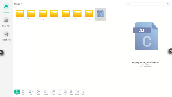 Copy the .crt certificate file to a USB flash drive and insert the drive to a USB port on the CommBox Classic S5